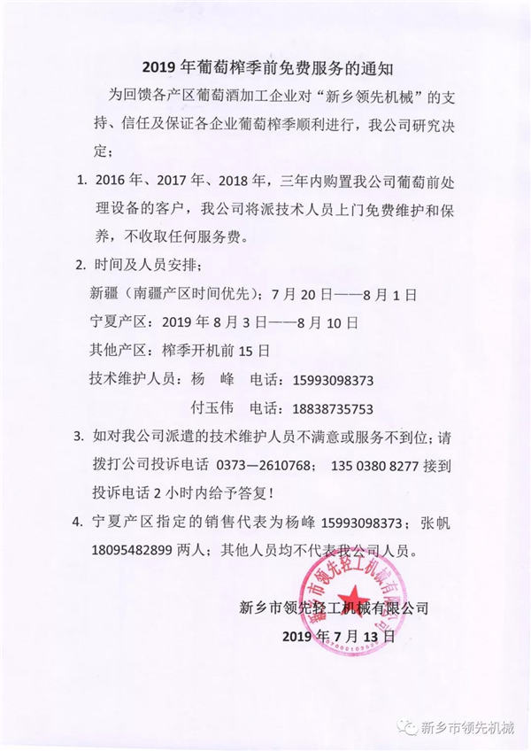 1. 2016年、2017年、2018年,三年内购置我公司葡萄前处理设备的客户,我公司将派技术人员上门免费维护和保养,不收取任何服务费。
