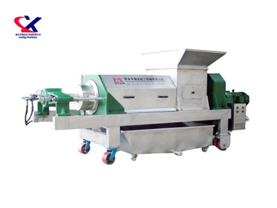 水果压榨机的工作原理,螺杆的左端支撑预压滚动轴承座,右端支撑设备的手轮轴承座。当螺杆开始运转时,螺杆将沿着材料出口方向的底部直径逐渐增加,从而使螺杆的螺距逐渐变小。当材料被螺杆强制推动时,螺杆腔的体积将变得越来越小挤压材料。这样,材料将被挤压,多余的水将被挤出以达到脱水效果。