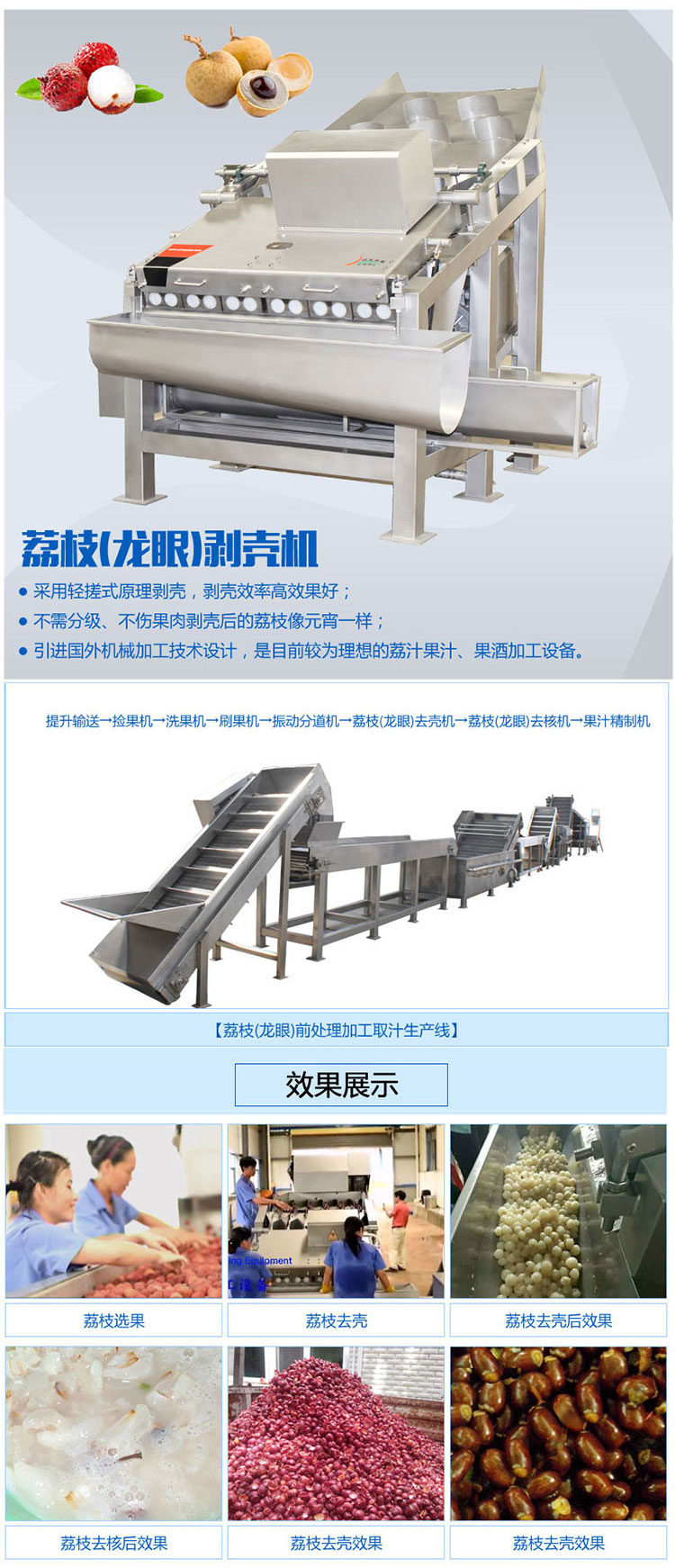 云南荔枝剥壳机适用于荔枝酒以及荔枝饮品前期处理,只有经过剥壳之后的荔枝才可以投入生产。该设备主要的功能是将荔枝进行去梗,清洗,消毒的过程,经过设备的处理,可以实现荔枝的果皮和果肉的分离。