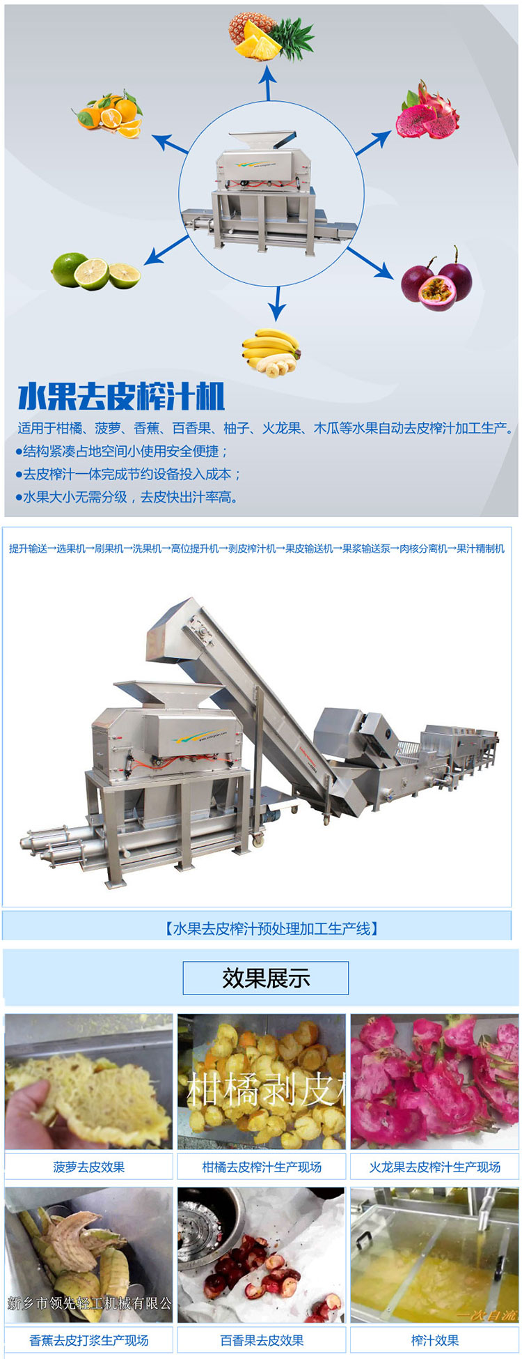 云南柑橘剥皮榨汁机是结合外国一些成熟的技术和设备的优点研制而成的,可以集去皮,榨汁为一体的设备,使用非常方便。该设备的生产效率高,不需要进行分级处理,产量达,每小时高达8-10吨的产量。